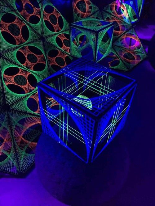 April 18, 1:15 a.m. DJ Technasia plays just a meter away while Suga performs live. In that fleeting moment, a thought crossed my mind: The Pyramid of Illumination—my latest commission, designed in collaboration with a group of artists from Colorado, creators of some of the world’s most renowned sacred geometry glass pieces.