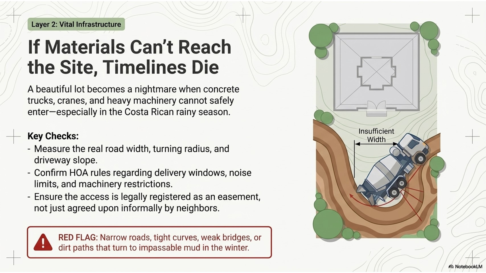 A beautiful lot becomes complicated when trucks and machinery cannot enter safely, especially in the rainy season. Access also affects the feasibility of concrete pours, cranes, prefabricated elements, and the overall schedule.
