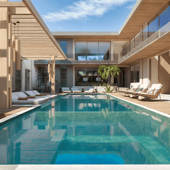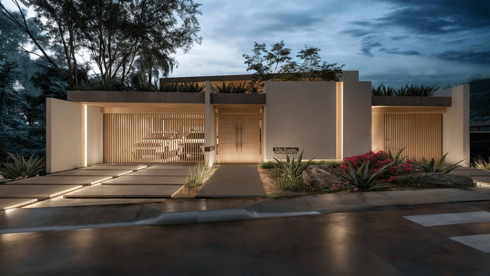 The architectural proposal envisions a two-level residence in a modern tropical style, situated near Playa Langosta. It is designed to blend seamlessly with the warm climate and lush coastal surroundings. The home is centered around a spacious terrace that serves as the social heart of the project and acts as a natural connector between the various living spaces. This terrace is enhanced by a long, elegant swimming pool that cools the environment and serves as a reflective water feature, enhancing the sense of openness and visually linking the interior with the landscape. At the core of the design is a generous internal garden that brings nature directly into the home, promoting cross-ventilation, abundant natural light, and a continuous sensory connection with the outdoors.