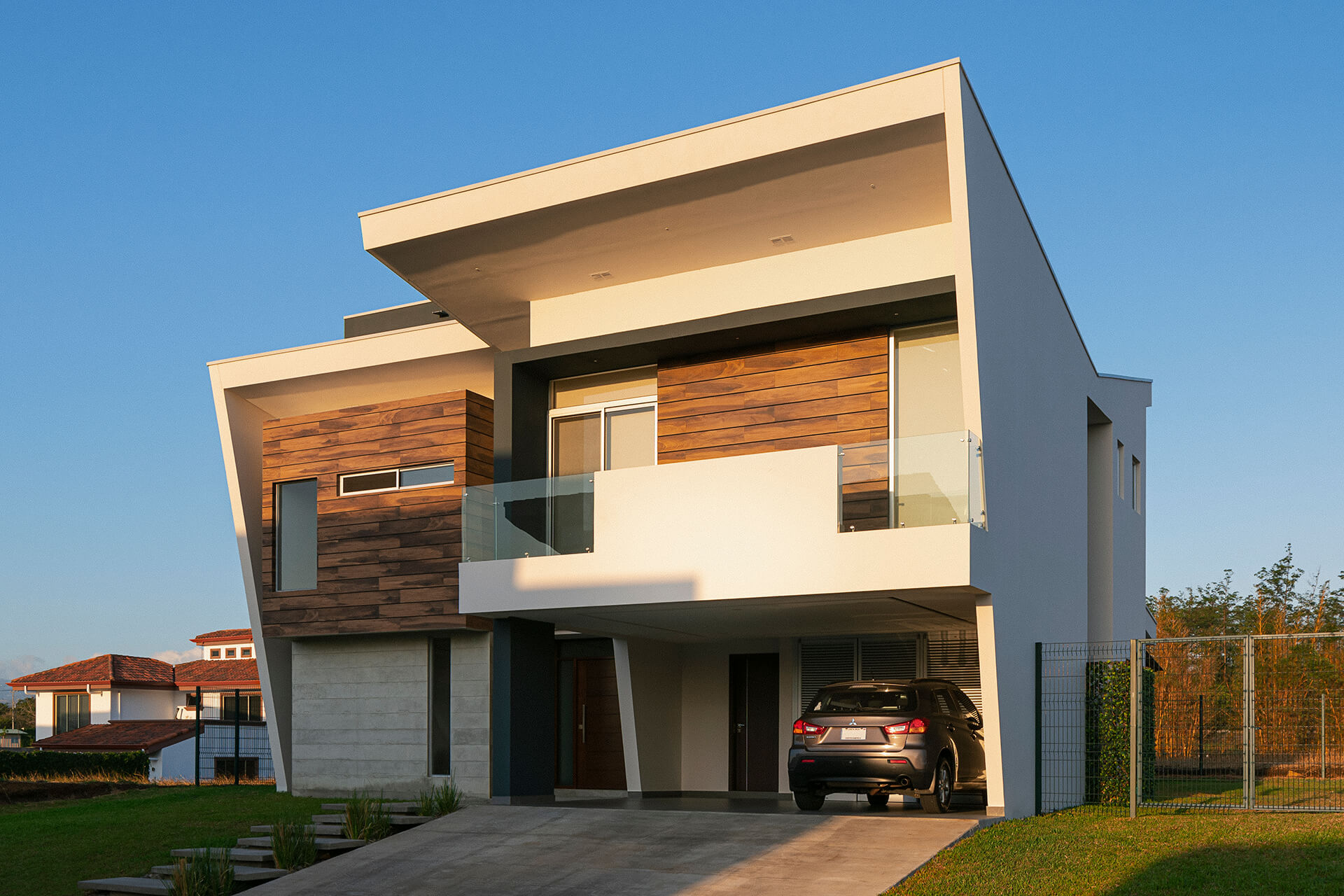 In the heart of a peaceful condominium in Curridabat, stands a residence that redefines modern elegance The exterior features warm and sophisticated wood finishes that blend well with the surrounding environment. The design boasts clean, contemporary lines and large windows that allow natural light to fill the interior spaces, seamlessly connecting them with the outside.